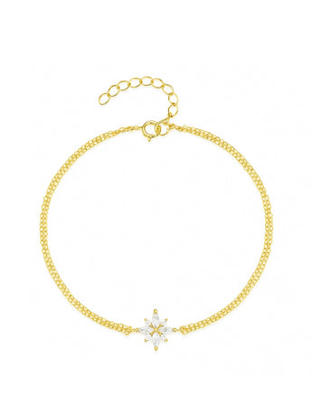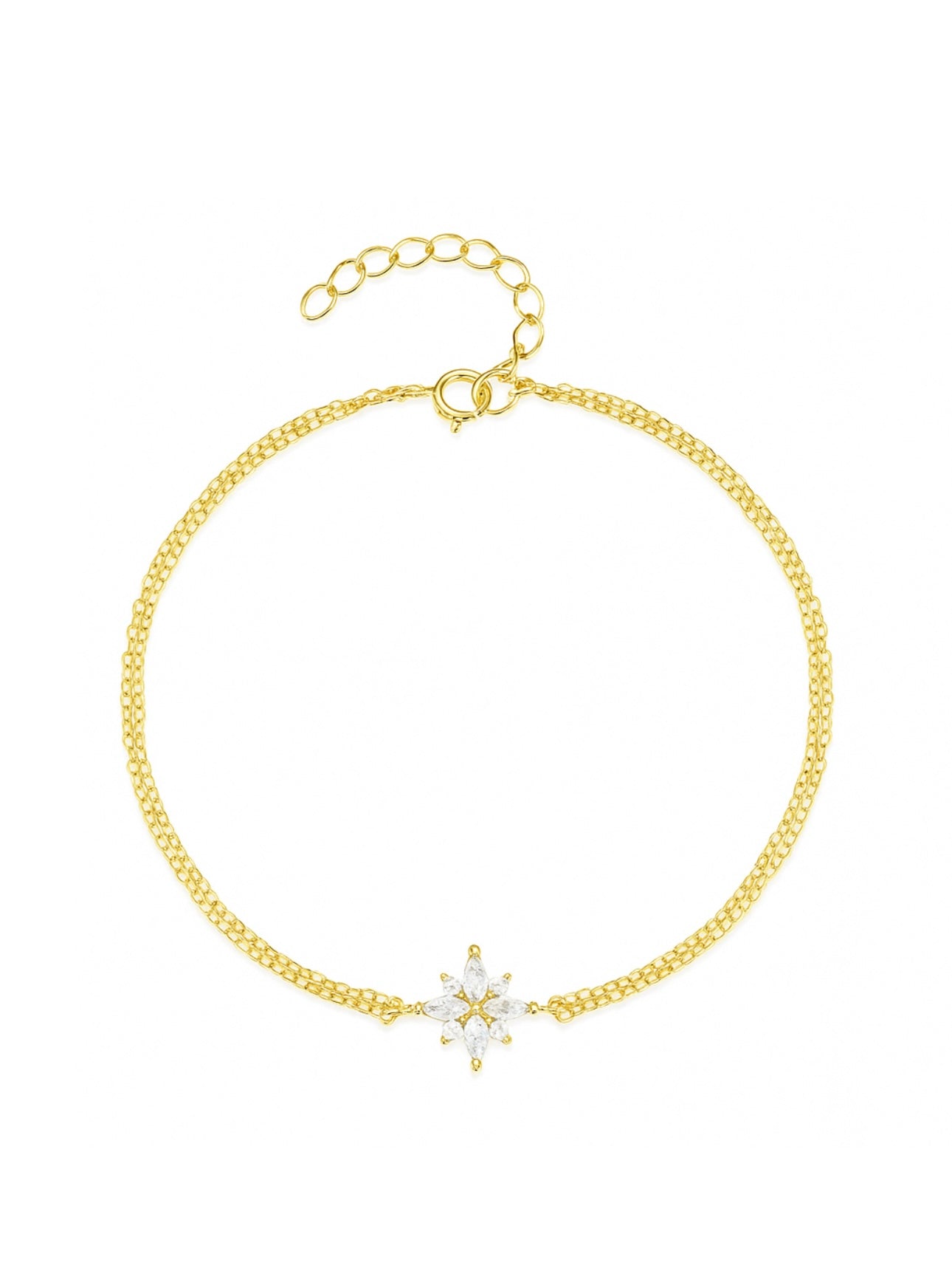A dainty and elegant bracelet that brings effortless charm to your everyday style. Featuring two fine gold chains and delicate flower charms, this layered design is perfect for adding a soft, feminine touch to any outfit. Lightweight and versatile, it's ideal for everyday wear, special occasions, or stacking with your other favourite pieces. Whether you're shopping for yourself or looking for a thoughtful gift, this gold flower bracelet is a must-have accessory for any jewellery lover. A beautiful piece that blends minimal design with floral detail – perfect for elevating your bracelet collection.