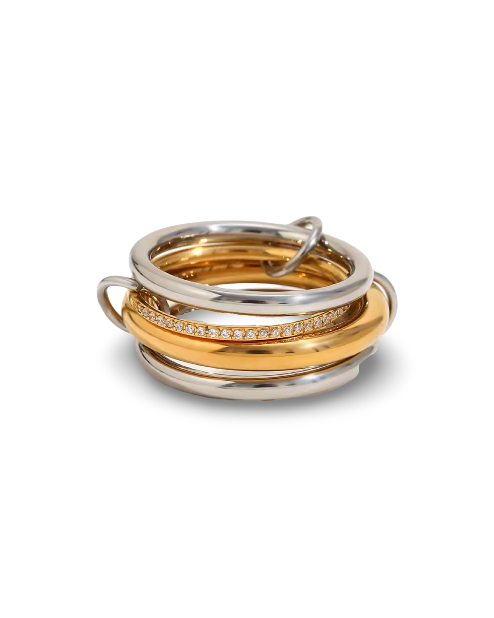 A harmonious blend of elegance and versatility. This ring showcases intertwined gold and silver bands, creating a sleek halo effect that complements any outfit. Its minimalist design ensures it pairs seamlessly with both casual and formal attire. Whether worn alone for a subtle statement or stacked with other rings for a layered look, this piece adds sophistication to any jewellery collection. Crafted with precision, it offers both comfort and durability, making it an ideal choice for those seeking timeless elegance with a contemporary twist.