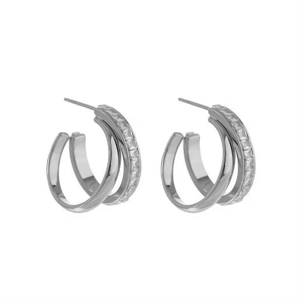 A sleek and modern addition to your jewellery collection. These earrings feature two interlocking silver hoops, creating a layered look that adds depth and sophistication to any outfit. Lightweight and comfortable, they're perfect for everyday wear or special occasions. Their minimalist style ensures versatility, making them a staple in any jewellery collection. Pair them with other silver accessories for a coordinated look or let them stand alone as a statement piece.