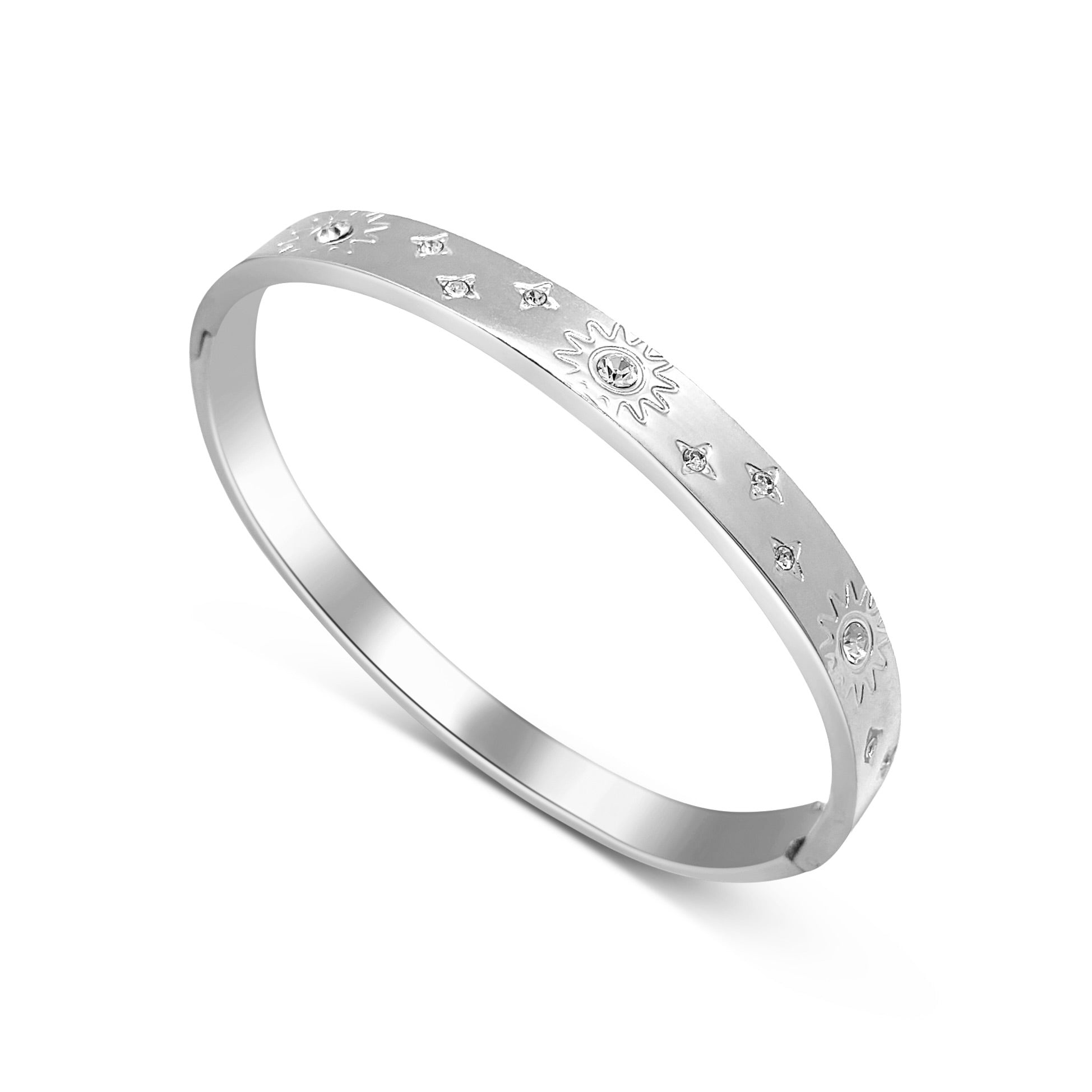 Add a celestial touch to your jewellery collection with the Silver Star and Sun Bangle, a charming piece that beautifully combines whimsy and elegance. This bangle features intricate sun and star motifs, creating a delightful design that enhances any outfit. Perfect for stacking or wearing alone as a statement piece, it’s ideal for both casual outings and special occasions. Crafted from high-quality materials, this bangle ensures durability and comfort for all-day wear. Embrace your unique style with this enchanting star and sun bangle!