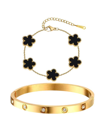 Add a touch of sophistication to your jewellery collection with the Gold Black Flower Bracelet and Bangle Set, a stunning duo that beautifully combines elegance with a playful edge. This set features a delicate bracelet and a matching bangle, both adorned with striking black flower accents that create a bold contrast against the radiant gold. Perfect for stacking or wearing individually, these pieces are ideal for both casual outings and special occasions. Crafted from high-quality materials, this set ensures durability and comfort for all-day wear. Embrace your unique style with this enchanting flower bracelet and bangle set!