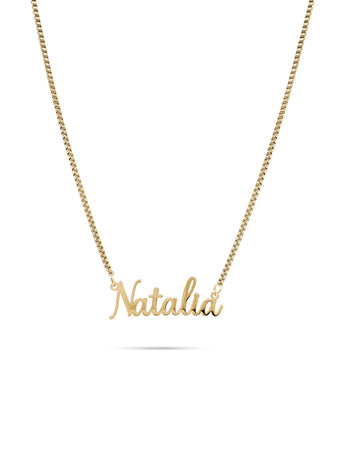 Personalize your jewellery collection with this elegant piece. Crafted from high-quality gold, this necklace features a delicate chain adorned with a name of your choice in graceful italic script. Its minimalist design ensures versatility, making it suitable for both everyday wear and special occasions. Whether you're celebrating your own name or honoring a loved one, this custom necklace adds a meaningful touch to any ensemble. Pair it with other gold accessories for a coordinated look or let it stand alone as a statement piece.