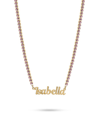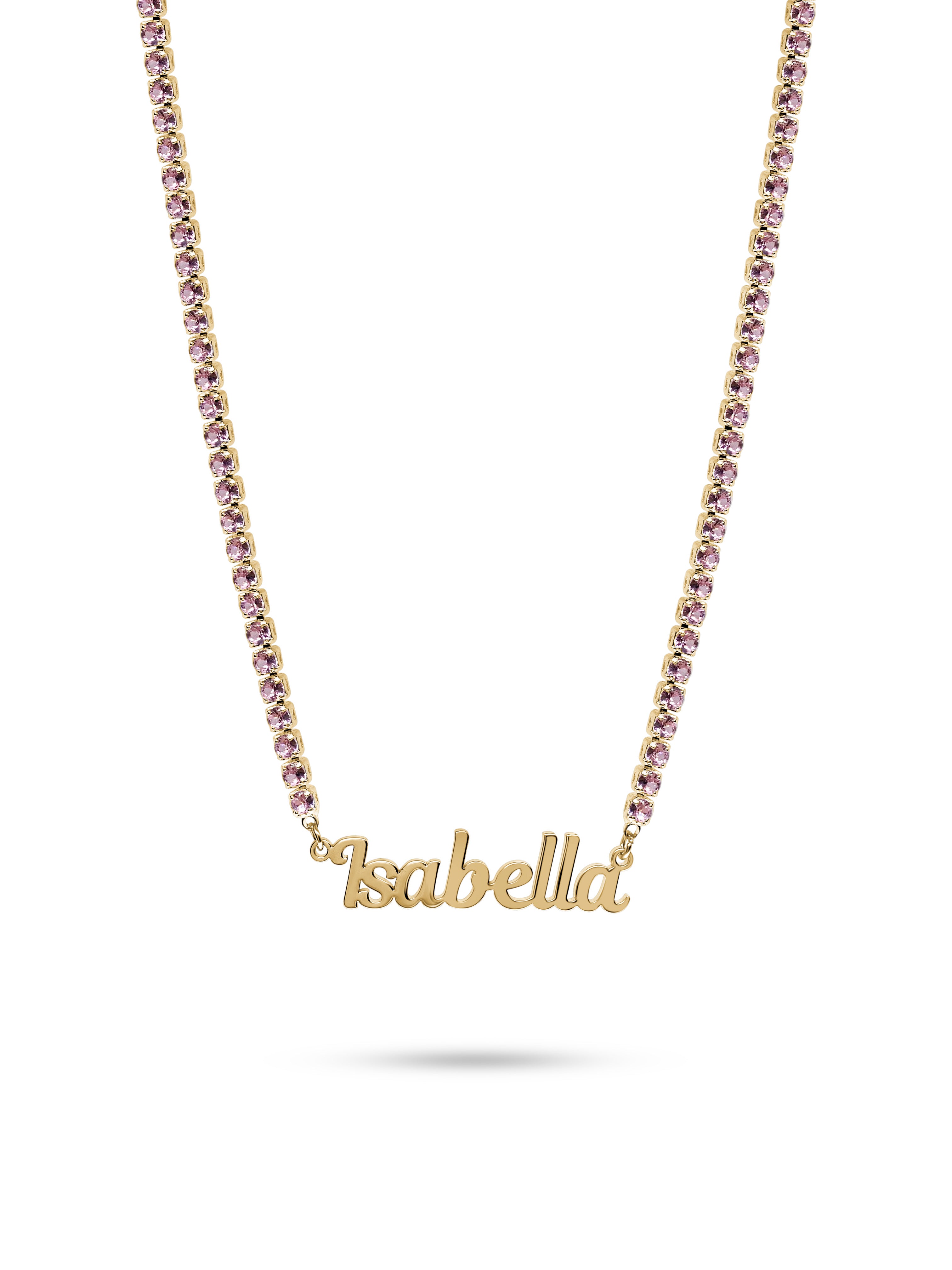 A personalized piece that combines elegance with a pop of color. This necklace features a radiant gold chain adorned with your chosen name or word, accented by a soft pink hue for added charm. Its sleek design ensures versatility, making it suitable for both everyday wear and special occasions. Whether you're treating yourself or searching for a thoughtful gift, the Gold Pink Icy Custom Name Necklace is a meaningful addition to any jewellery collection. Please note, as a custom product, delivery may take 2-3 weeks.
