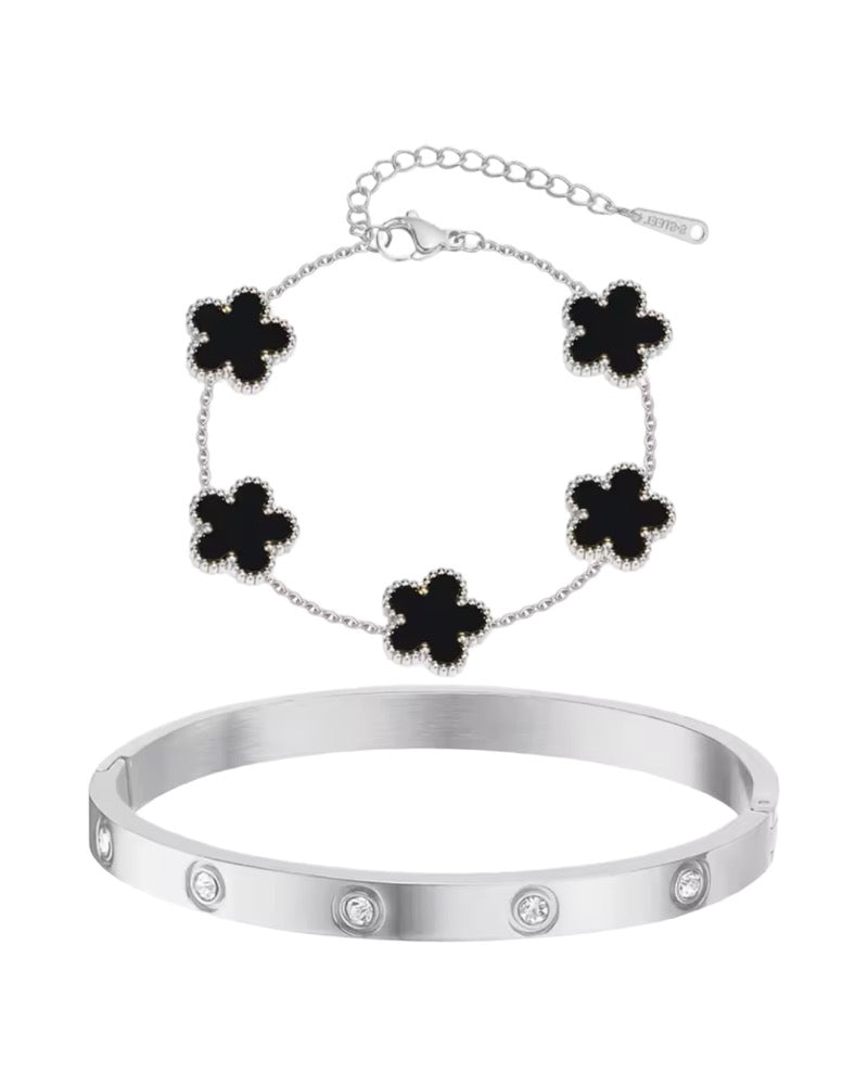 Elevate your accessory collection with the Silver Black Flower Bracelet and Bangle Set, a charming duo that beautifully combines elegance and a touch of whimsy. This set features a delicate bracelet and a matching bangle, both adorned with striking black flower accents that add a unique flair to any outfit. Perfect for stacking or wearing separately, these pieces are ideal for both casual outings and special occasions. Crafted from high-quality materials, this set ensures durability and comfort for all-day wear. Embrace your unique style with this enchanting flower bracelet and bangle set!
