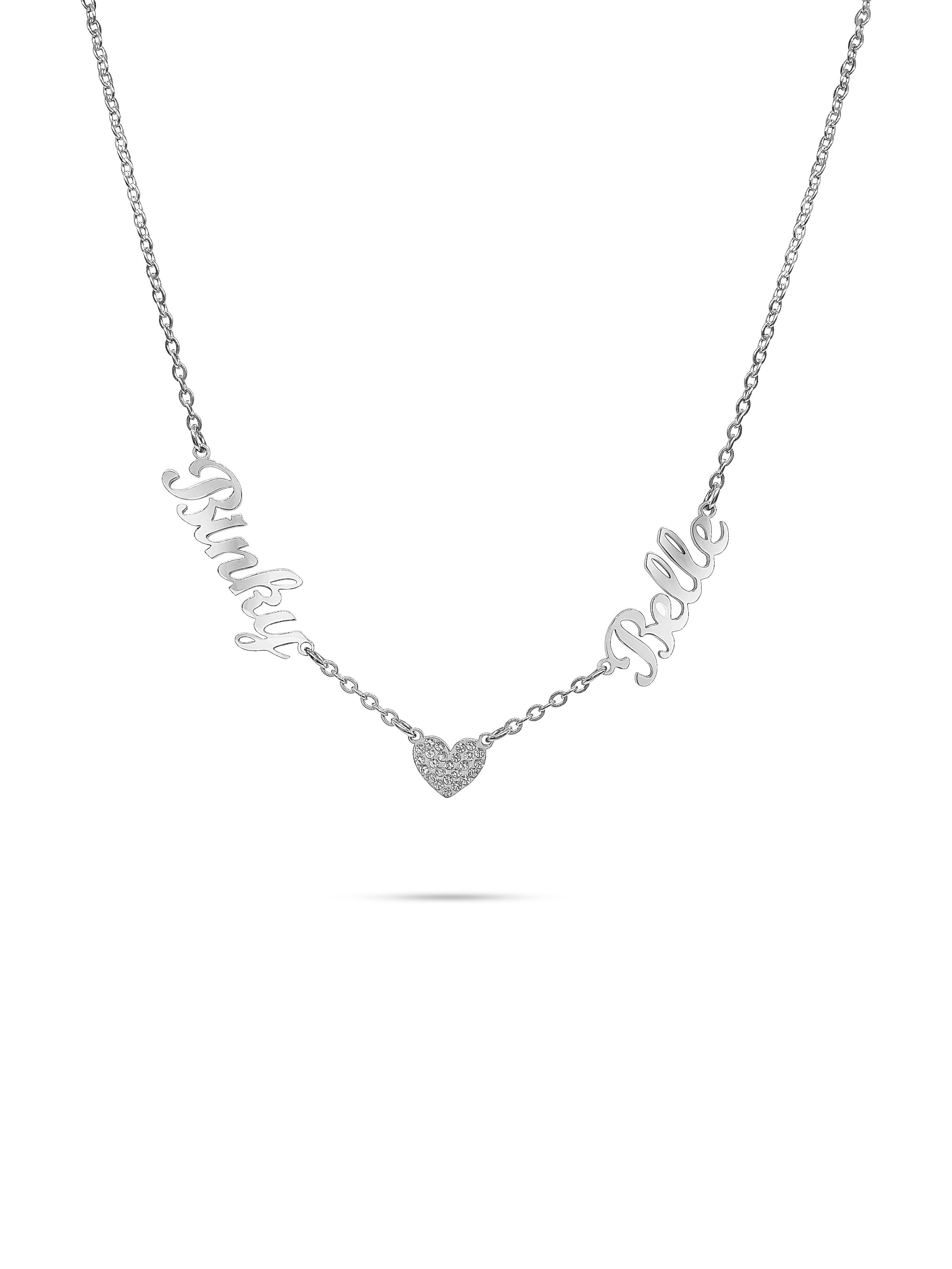 Celebrate cherished bonds with this personalized piece. Crafted from high-quality silver, this necklace features a delicate heart pendant engraved with two names of your choice, symbolizing a special connection. Its elegant design makes it suitable for both everyday wear and special occasions. Whether honoring a loved one or commemorating a meaningful relationship, this custom necklace adds a heartfelt touch to any jewellery collection. Pair it with other silver accessories for a coordinated look or let it stand alone as a statement piece.