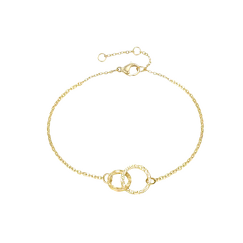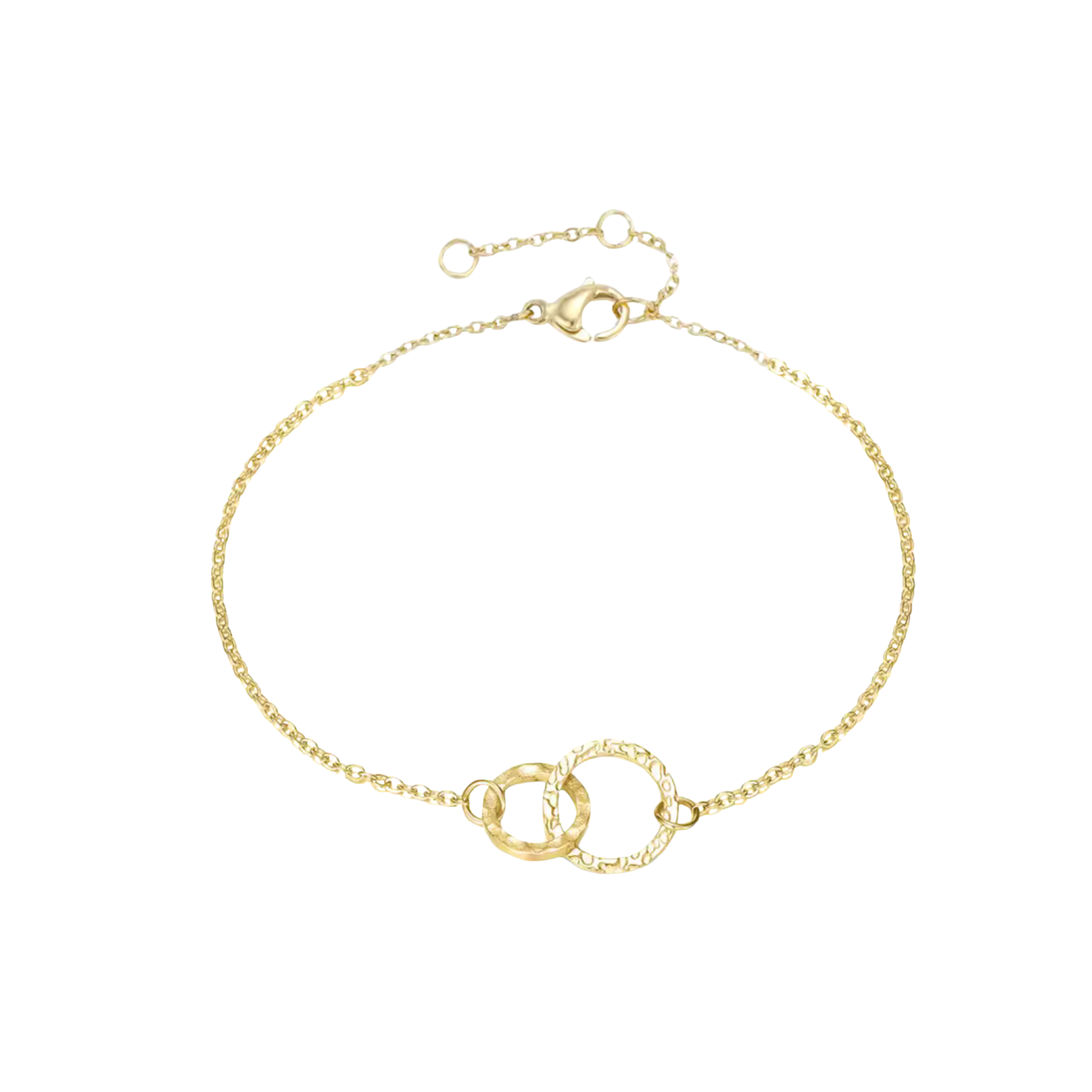 This elegant bracelet features two intertwined gold toned circles on a delicate adjustable chain, symbolising meaningful connection and unity in a minimalist design; crafted with waterproof, tarnish resistant stainless steel, it shines beautifully whether layered or worn solo.