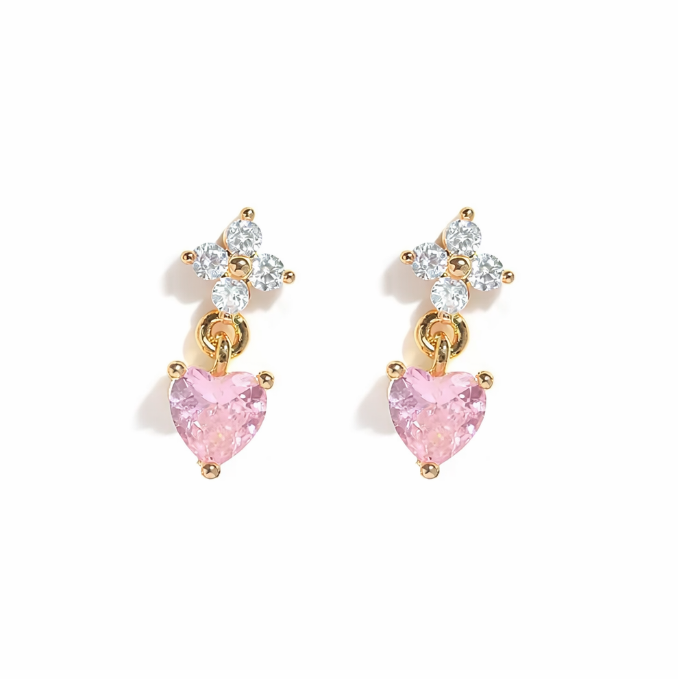A cute, girly pop of charm for your everyday stack, the Gold Clover Pink Heart Studs feature gold-plated, waterproof, tarnish-free studs designed with a delicate clover shape and soft pink heart accents that add the perfect mix of sweetness and sparkle, making them the ideal gold heart stud earrings, pink heart studs, and playful everyday jewellery for anyone who loves dainty pieces with a fun, romantic vibe.