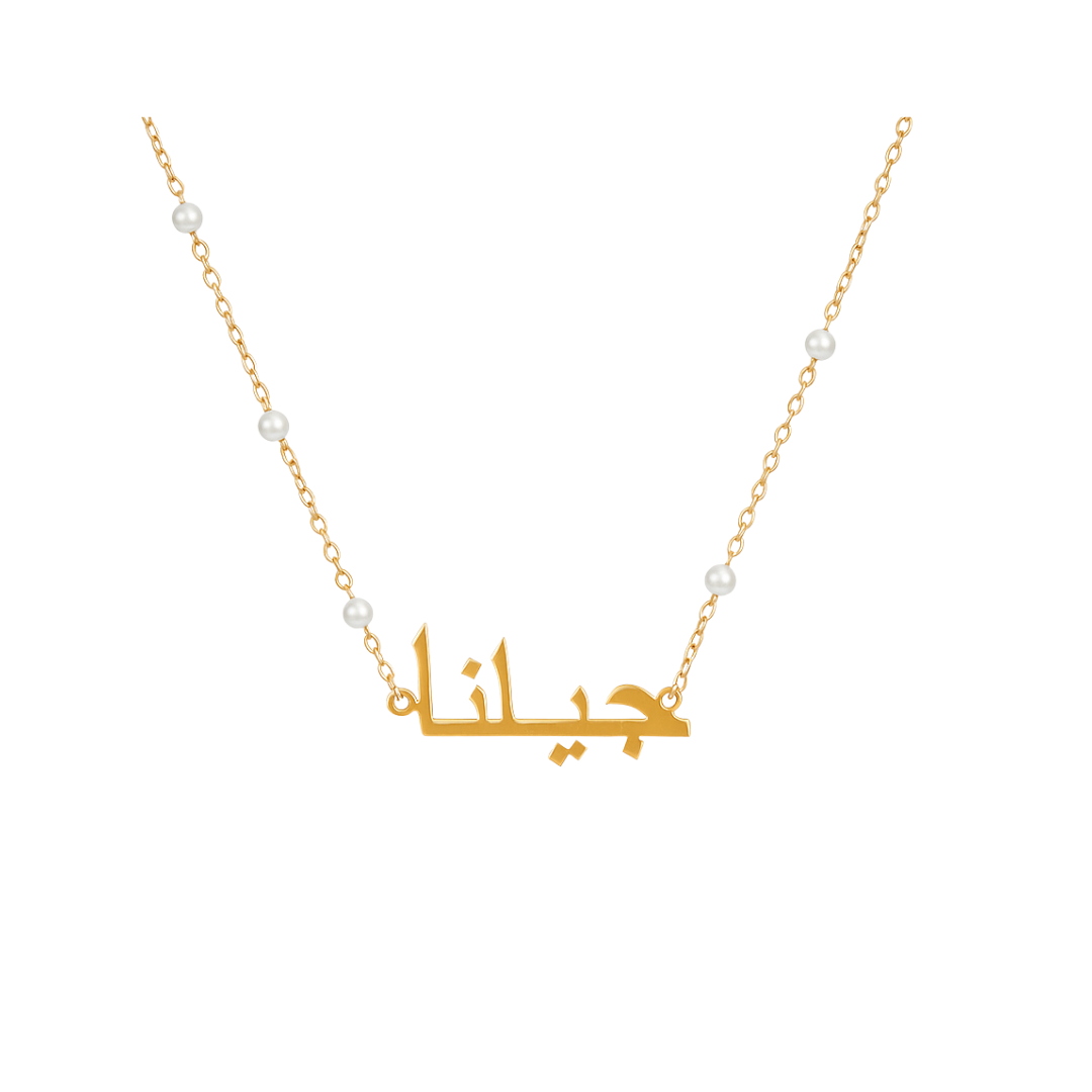Celebrate your individuality with the Gold Dainty Pearl Arabic Custom Necklace. This exquisite piece features a delicate gold-plated stainless steel chain adorned with dainty pearls, culminating in a custom nameplate rendered in graceful Arabic script. Crafted for both beauty and resilience, the necklace is waterproof and tarnish-resistant, ensuring it maintains its lustrous shine through daily wear.