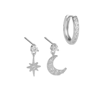 Adorn your ears with cosmic charm thanks to our Silver Moon & Star Studs & Hoops set. Featuring a delicate star stud, a dainty crescent moon stud, and a sleek polished hoop—all crafted from durable, waterproof, tarnish-resistant stainless steel—this trio offers effortless layering and celestial style. Perfect for everyday wear and built to maintain its radiant shine through showers, workouts, and salty air, these pieces add a touch of the night sky to any outfit with ease and grace.