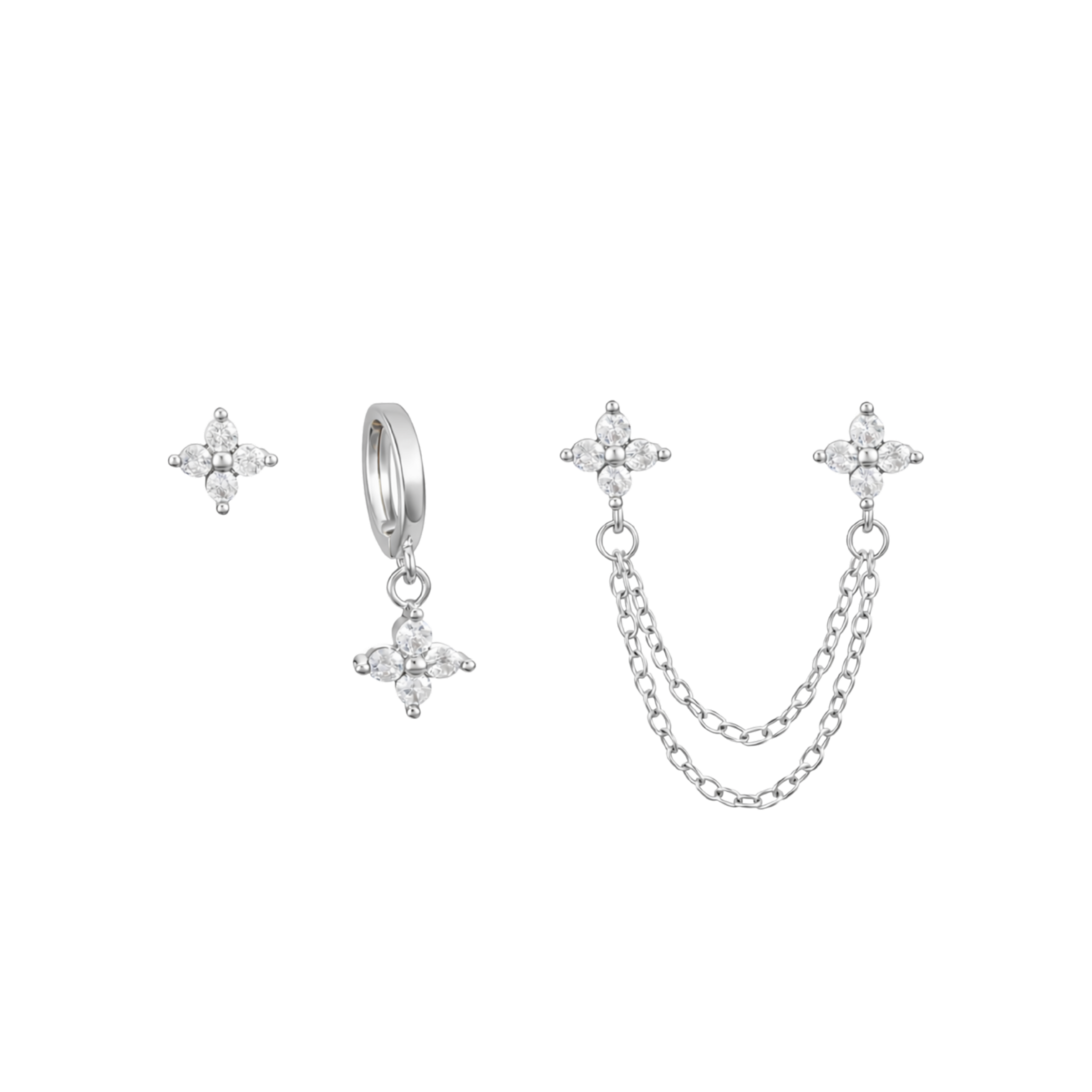 A cute, lucky charm for your ear stack, the Silver Clover Chain and Huggie Set features sleek silver-tone, waterproof, tarnish-free huggie hoops linked with a delicate chain and finished with a dainty clover charm, making it the perfect silver clover earrings, chain huggie set, and everyday statement piece for anyone who loves meaningful jewellery with an effortlessly cool, girly vibe.