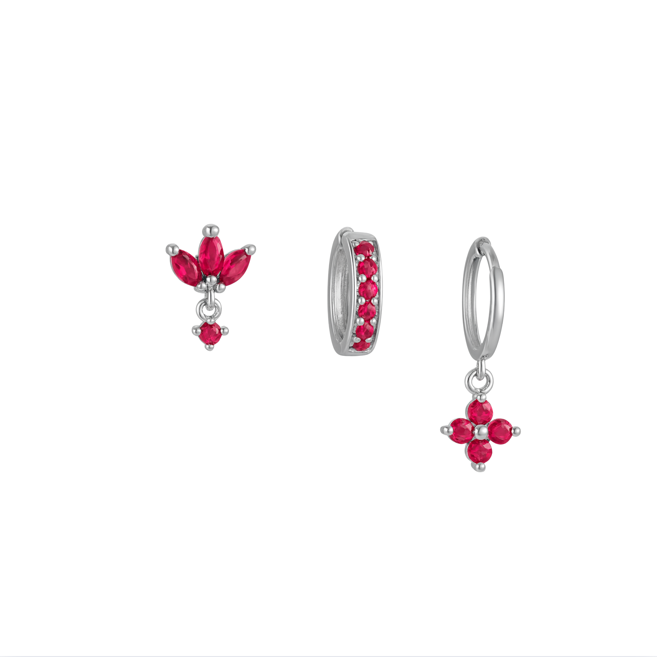 Silver Pink Clover Trio Huggie Set