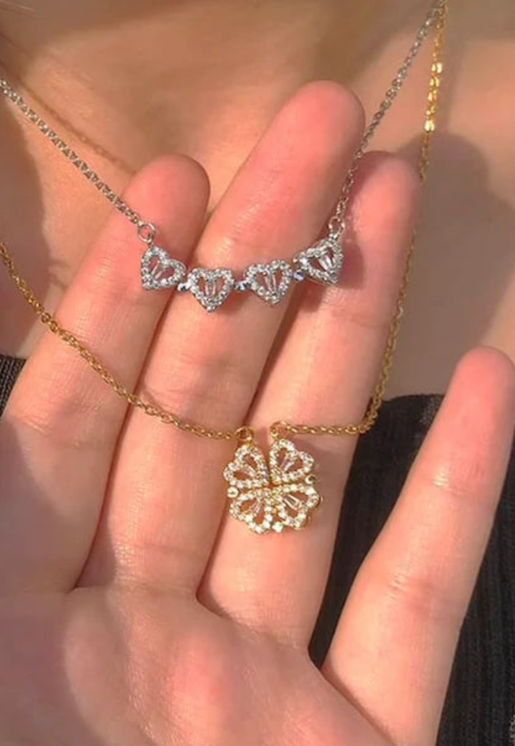 - Magnetic necklace, opens from a ‘flower made out of hearts’, to a row of 4 hearts