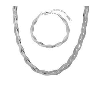 The Silver Twisted Necklace and Bracelet Set features a sleek, twisted rope design in both the necklace and bracelet, offering a cohesive and elegant look. Perfect for everyday wear or special occasions, this set adds a modern and stylish touch to any outfit.
