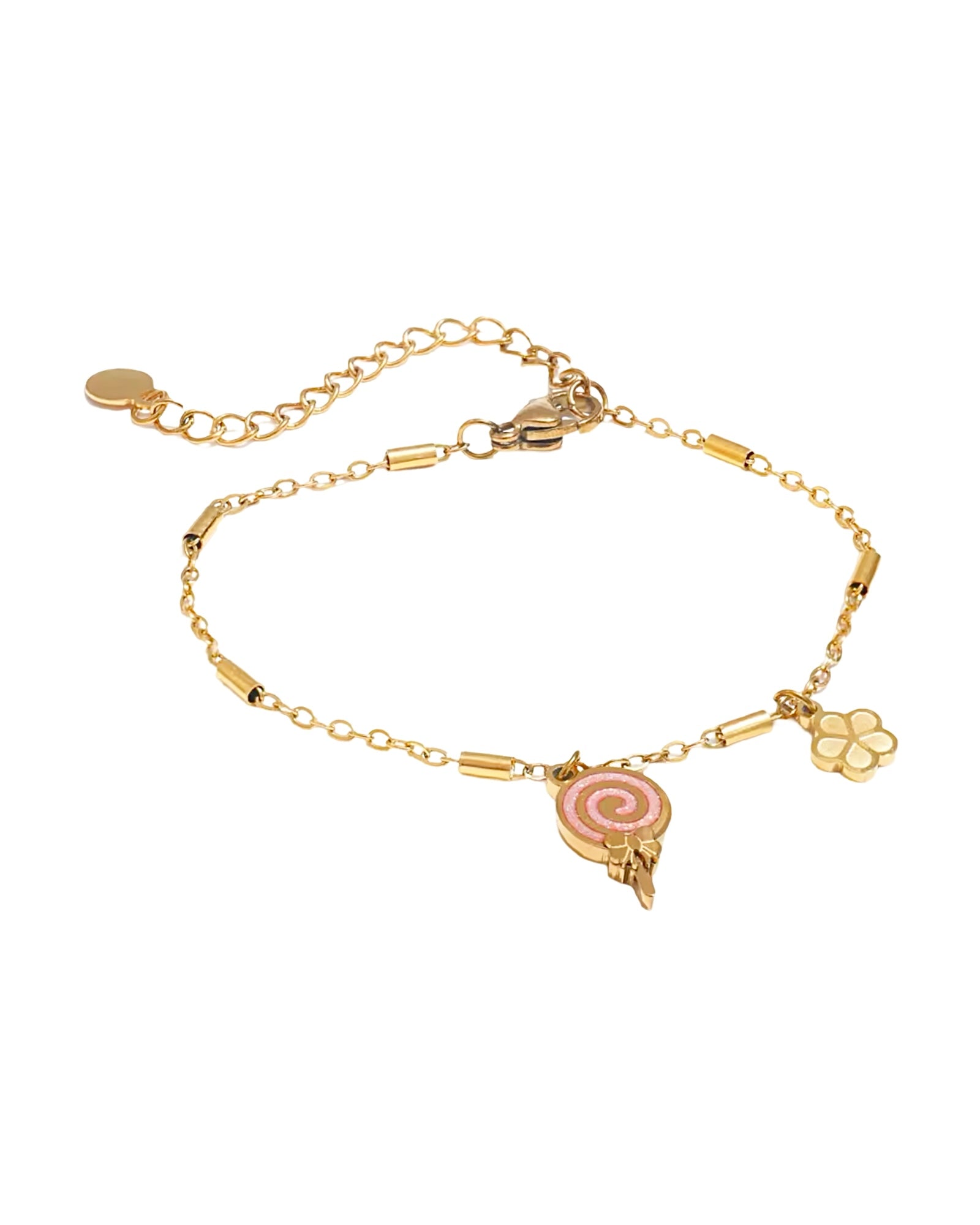 Add a playful touch to your jewellery collection with this charming piece. Featuring a delicate gold chain adorned with a lollipop-shaped pendant, this bracelet brings a whimsical flair to any ensemble. Its adjustable design ensures a comfortable fit for various wrist sizes, making it perfect for everyday wear or special occasions. Whether you're treating yourself or searching for a delightful gift, the Gold Lollipop Bracelet is a sweet addition to any accessory lineup. Pair it with other gold pieces for a coordinated look or let it stand alone as a fun statement.