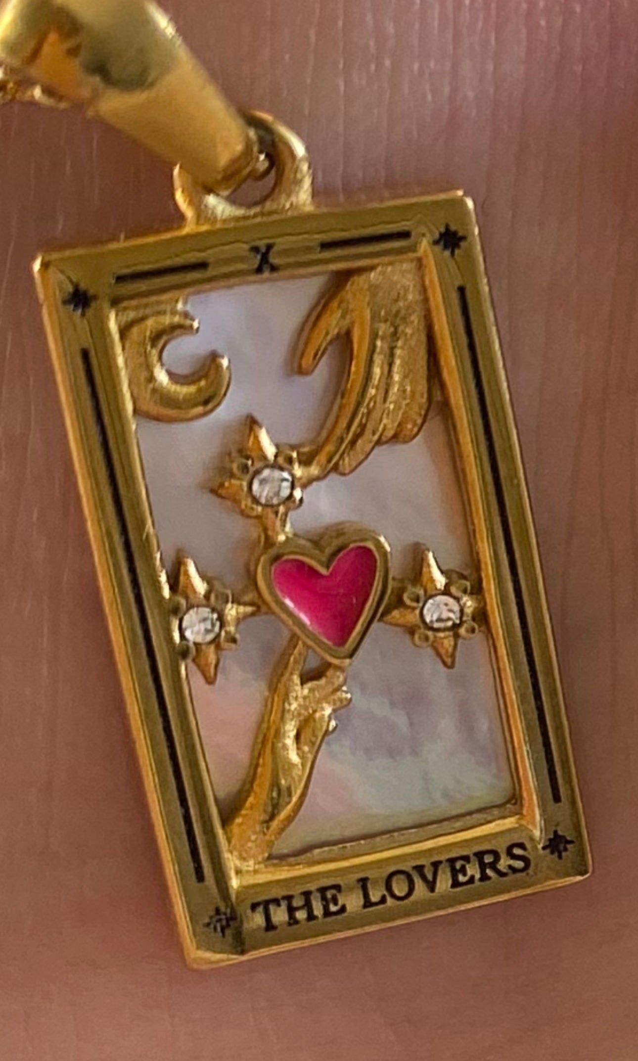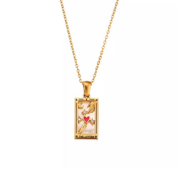 Add a symbolic touch to your look with the Lovers Gold Tarot Necklace! This stunning gold-plated necklace features a tarot card-inspired design with "The Lovers" card, perfect for adding a bit of mystical flair to your outfit. Whether you're a fan of tarot or simply love unique, eye-catching accessories, this necklace is a versatile and chic statement piece that can elevate any outfit.